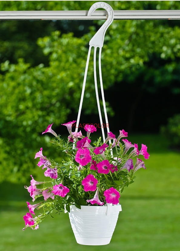 Doniczka wisząca z podstawką i uchwytem w dwóch kolorach.